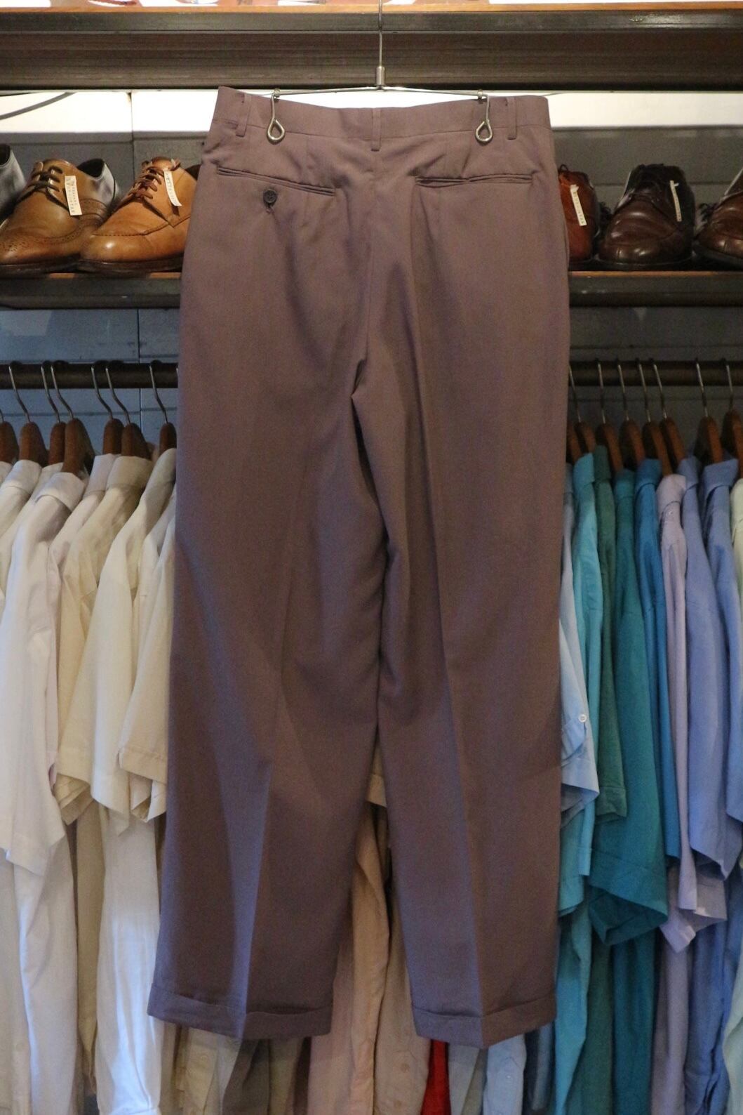 テロテロの生地に落ち着いたお洒落な色合いのツータックスラックスです。